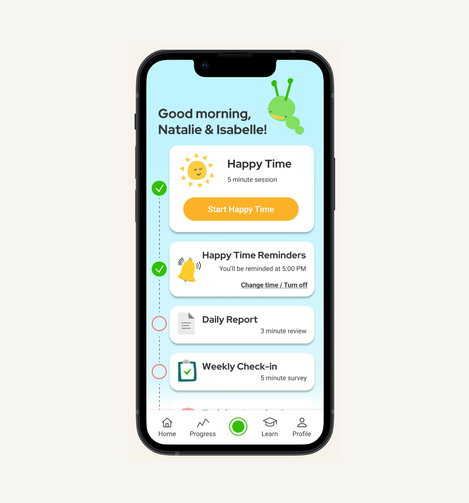 We designed the Happypillar home screen to feel inviting and informative. We created a task tracker so users could easily see what they need to do each time they log in. By creating a checkbox toggle bar, we motivated users to complete their Happy Time sessions and continue learning new skills to improve their relationships and make progress with their child/children.