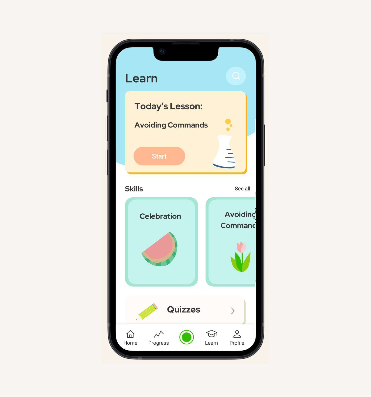 Within the app, users have the opportunity to learn more about the skills they use during Happy Time sessions. We created a Learn landing page to house all the different skill categories as well as a variety of templates for different quiz options. Users can complete a daily lesson that includes an overview of the skill along with a quiz. Specific topics are recommended based on their Happy Time feedback reports to help them further develop lacking skills.