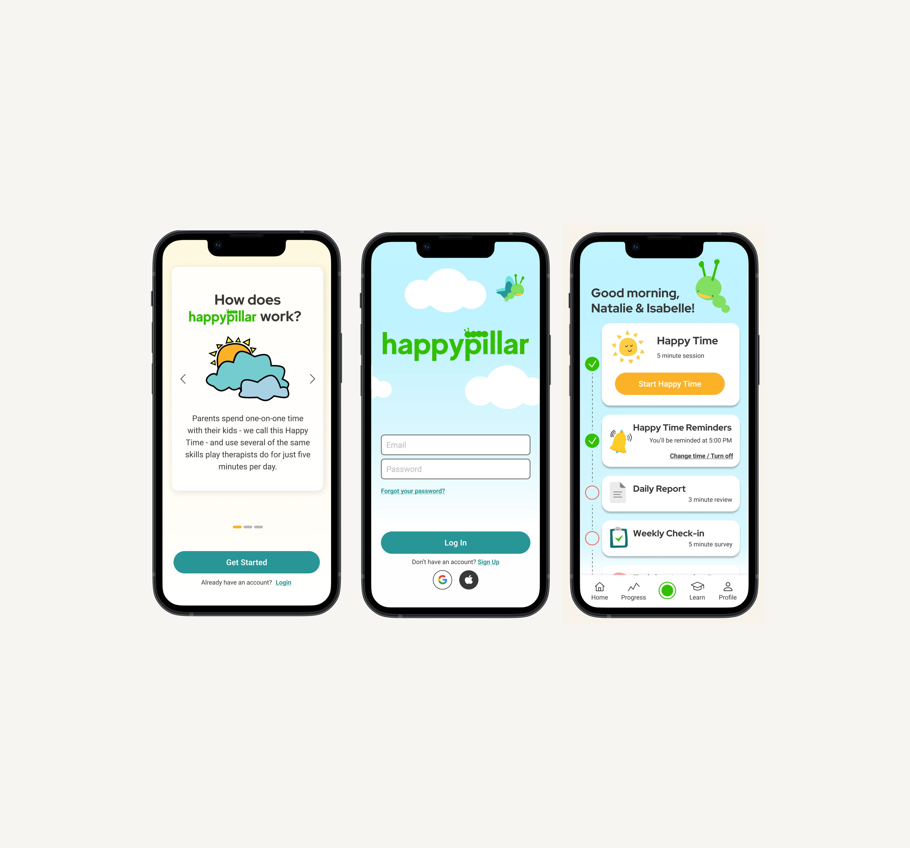 End-to-end product design for the release of Happypillar's mobile application — an AI-powered platform helping parents build stronger relationships with their children through evidence-based therapy techniques.