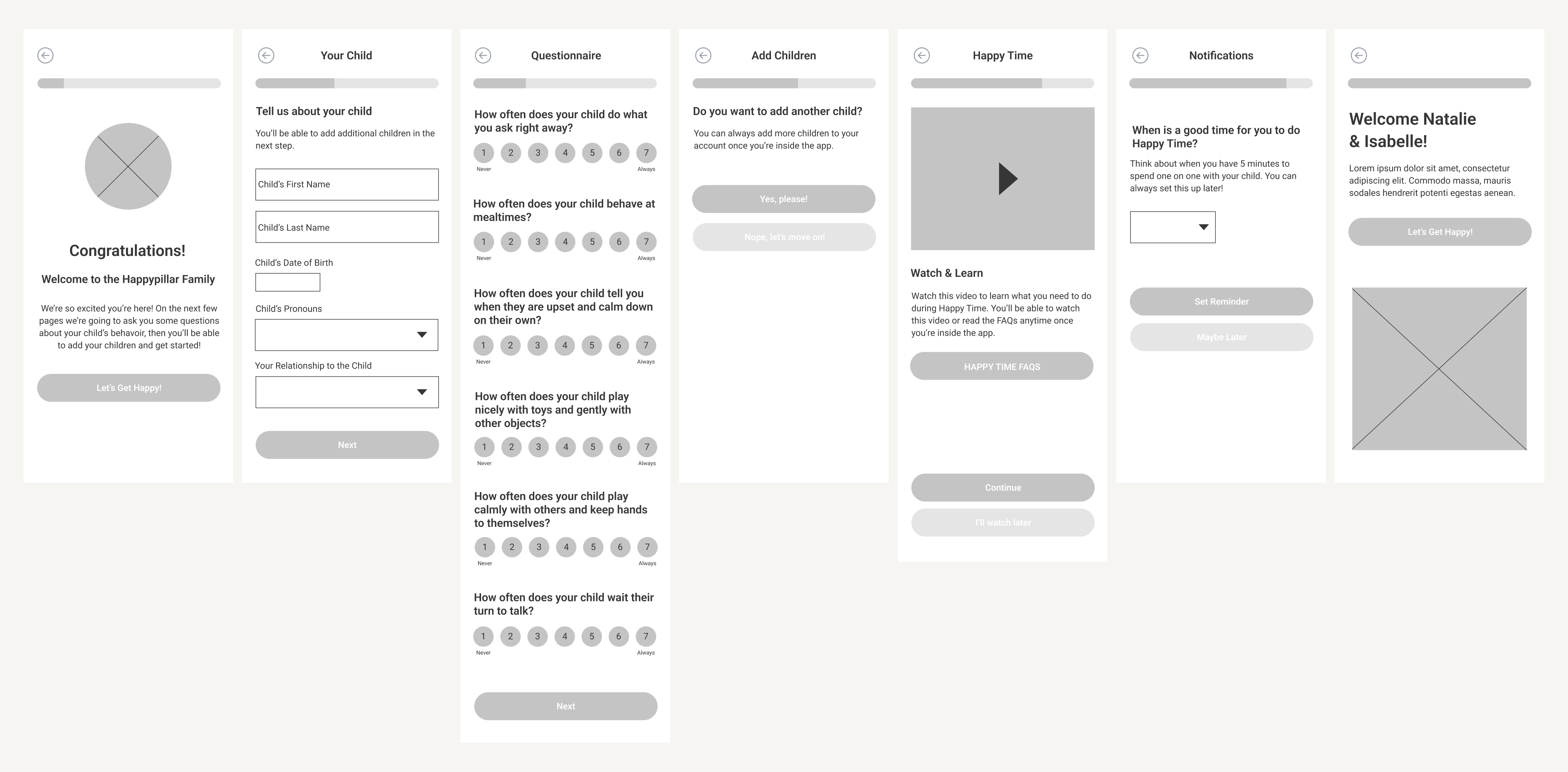 We worked with Happypillar's therapist-in-residence to create an onboarding experience that mimicked the in-person process — establishing trust and gathering the appropriate information to ensure the best possible experience for the user and their child/children while using Happypillar.