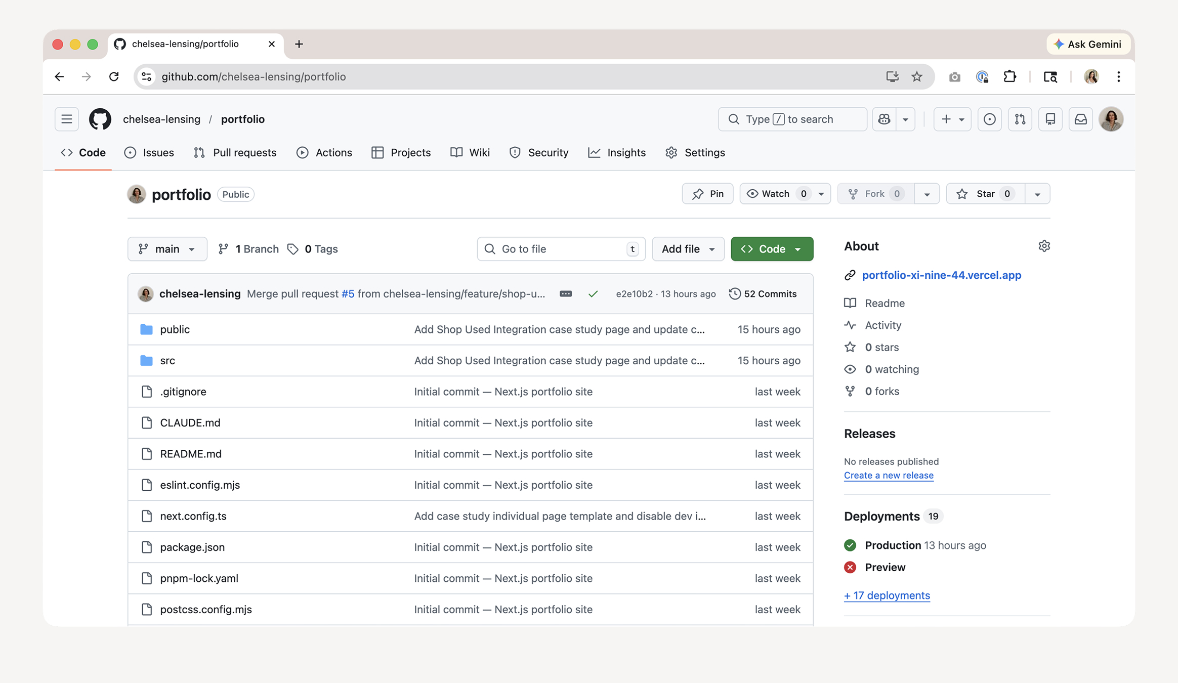 With a working codebase taking shape, I connected the project to GitHub directly from the terminal. Using Git from the command line — guided by Claude Code when needed — I committed the site in logical increments, treating each component or page as its own unit of work.