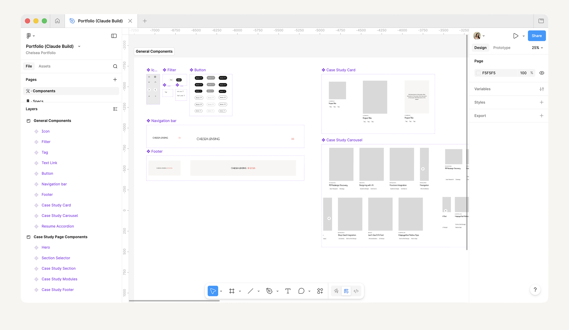 The design process followed a deliberate sequence: components first, layouts second. Before touching a single page, I built out the component library in Figma — defining type styles, color tokens, and spacing rules, then assembling them into the UI elements the site would be built from.