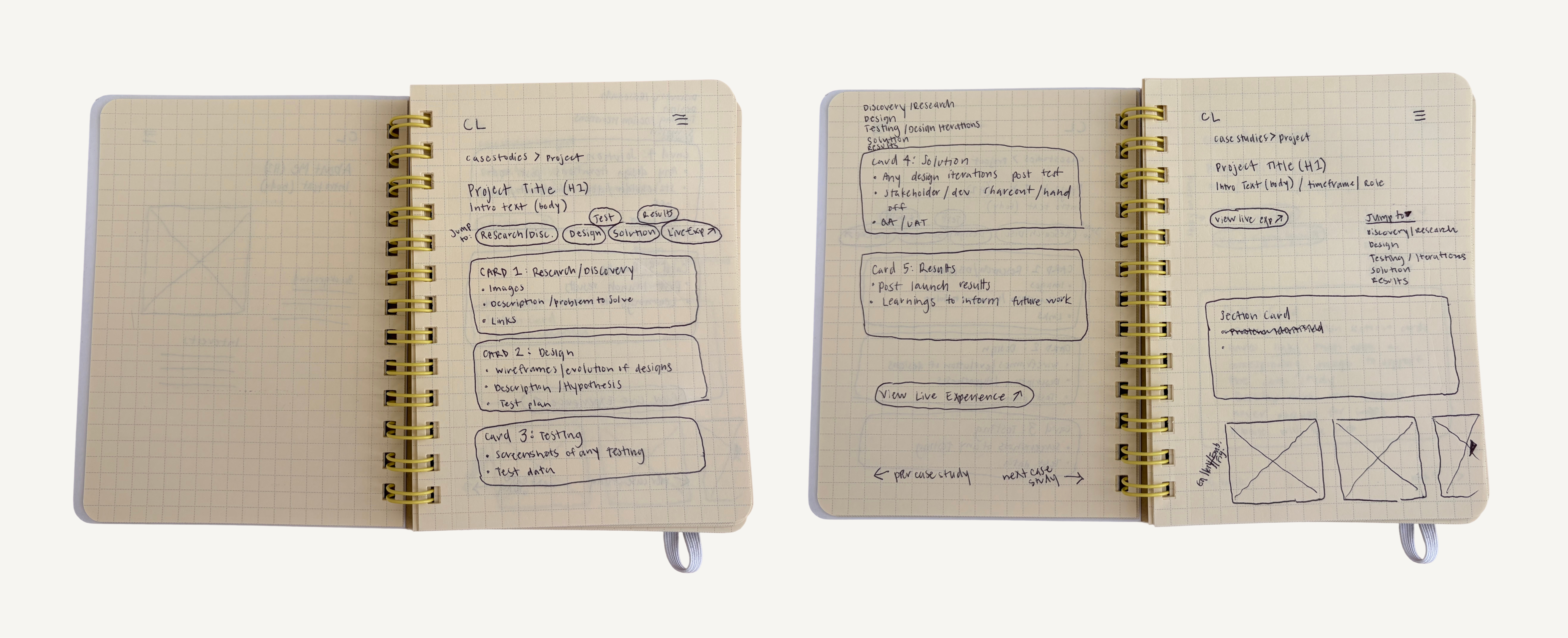 The idea started analog. Before opening Figma or any digital tool, I spent time sketching rough layouts, thinking about information architecture, and establishing what I wanted the portfolio to communicate. The sketches weren't precious — they were fast explorations of page structure, content hierarchy, and navigation patterns.