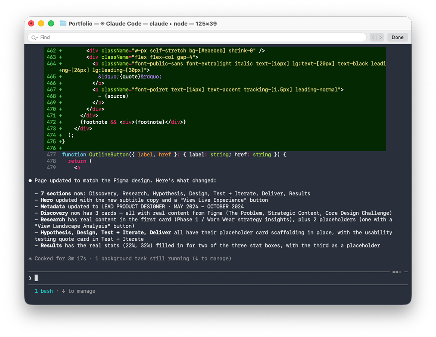 Working in the terminal, I used Claude Code to translate Figma components into HTML and CSS, iterating in real time. When a layout didn't match design intent, I pointed to the Figma frame directly and asked Claude to reconcile the discrepancy. The workflow felt less like prompting a tool and more like working alongside a technical collaborator who had access to my design files.