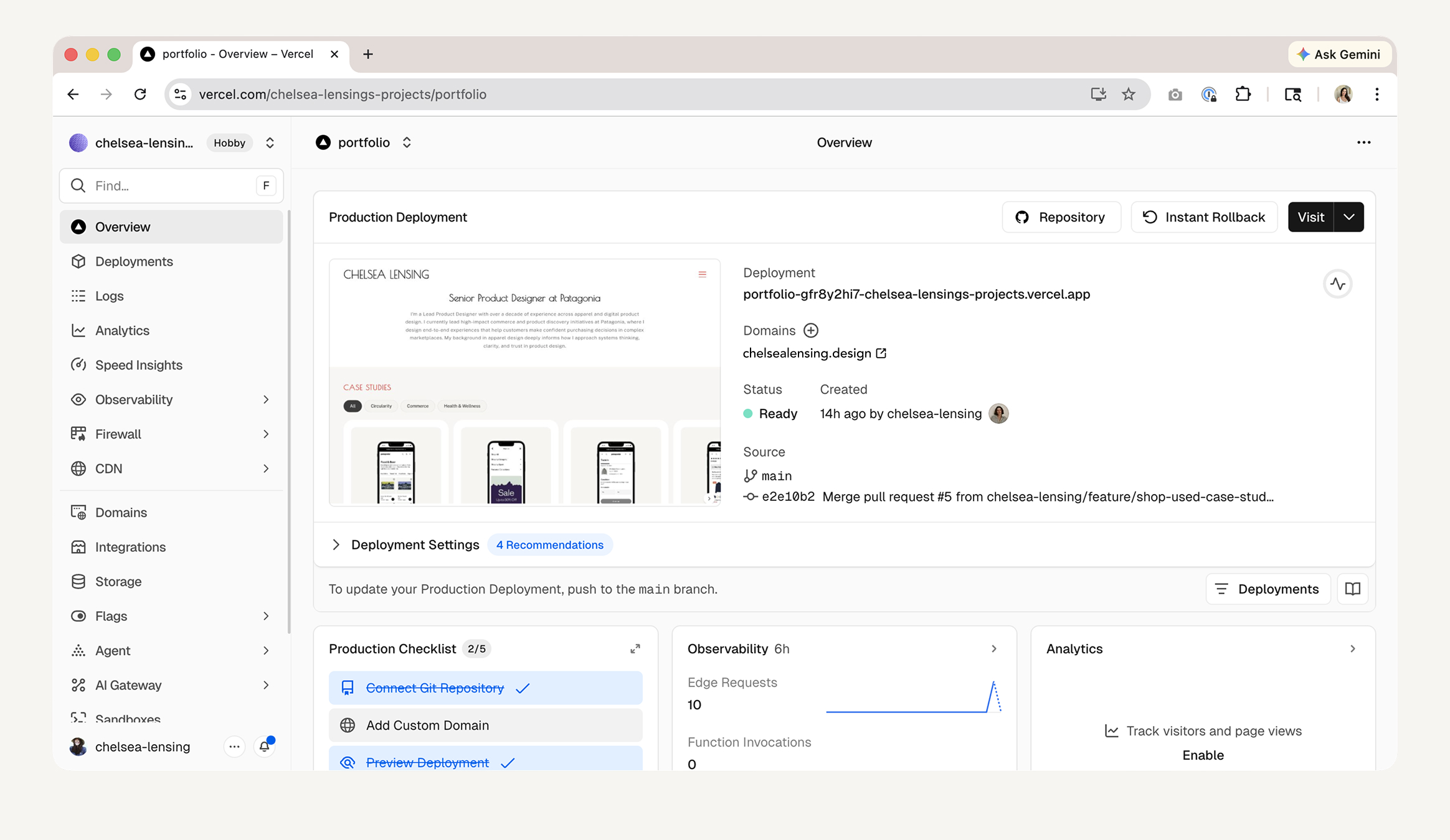 Deployment was handled through Vercel, connected directly to the GitHub repository. Every push to the main branch triggered an automatic build and deploy — meaning the live site stayed in sync with the codebase without manual intervention.